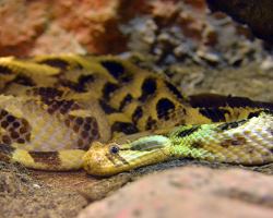 A hím kisebb, mint a nőstény. Bőre érdes-pikkelyes, színe jó álcát nyújt. Mintázata az állat élőhelyétől függ, általában azonban egész testét V-formájú sorminta fedi. A nőstény színezete ragyogóbb. Feje széles, lapos és lándzsa formájú.