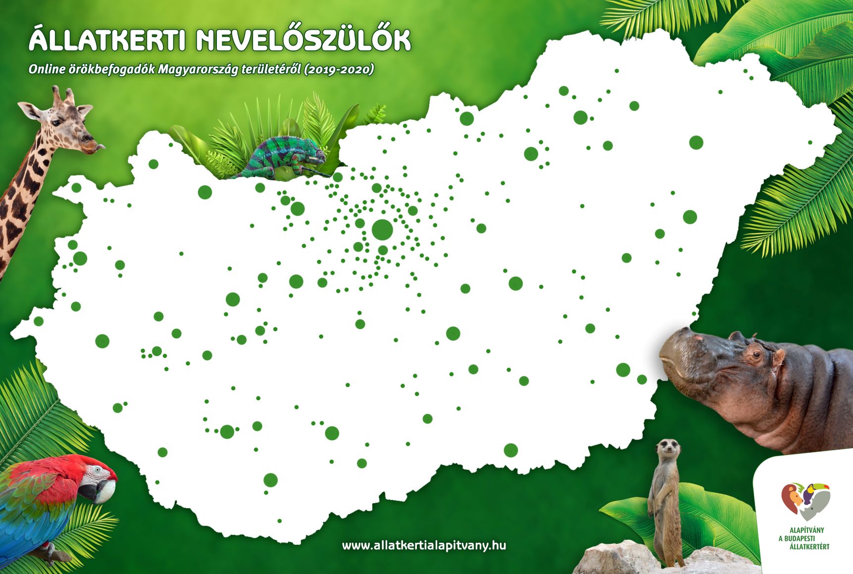 Összesen 288 magyarországi településen élnek állataink örökbefogadói és még jó néhány helyen a világban, Ausztriától Svájcig. Nem is tudtunk olyan nagy felbontású térképet készíteni, ahol minden egyes település látszik, így csak néhány érdekességet emelünk ki. A válogatás persze önkényes és nem is teljesen megbízható adatokon nyugszik, hiszen az örökbe fogadóknak nem kötelező megadniuk a címüket és ezzel a lehetőséggel sokan élnek is.